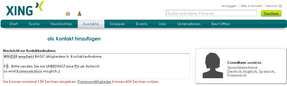 Bei Kontaktaufnahme trotz max. nur 150 Zeichen ein P.S. einfügen